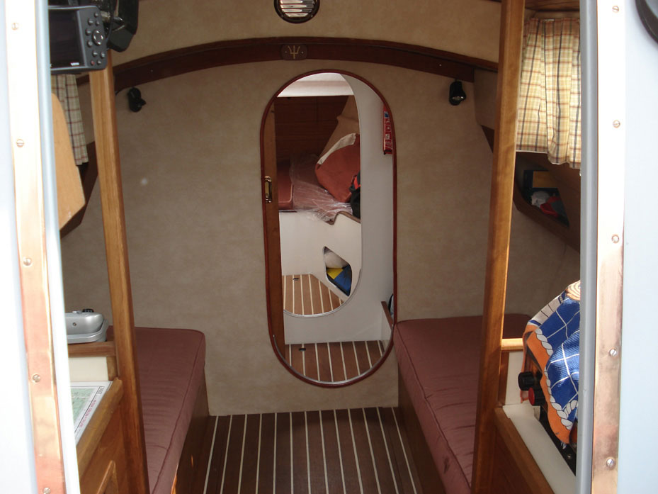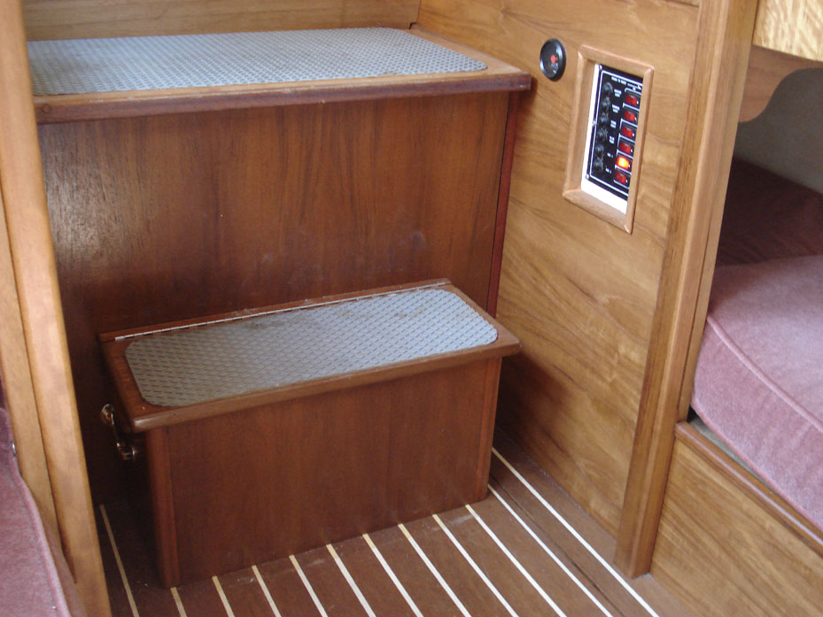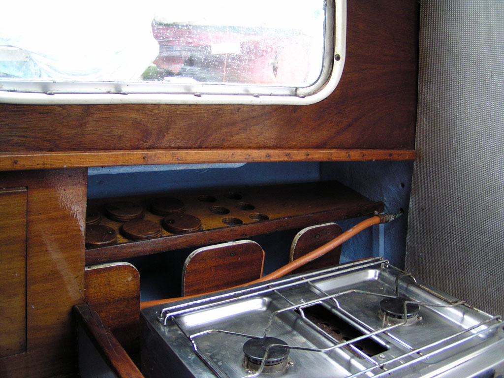 The chart table was shorter than standard and the size of the Bukh 10 meant it sat below the top of the engine box which stood higher than the sill of the companionway. Entering the cabin meant stepping up and over the engine.