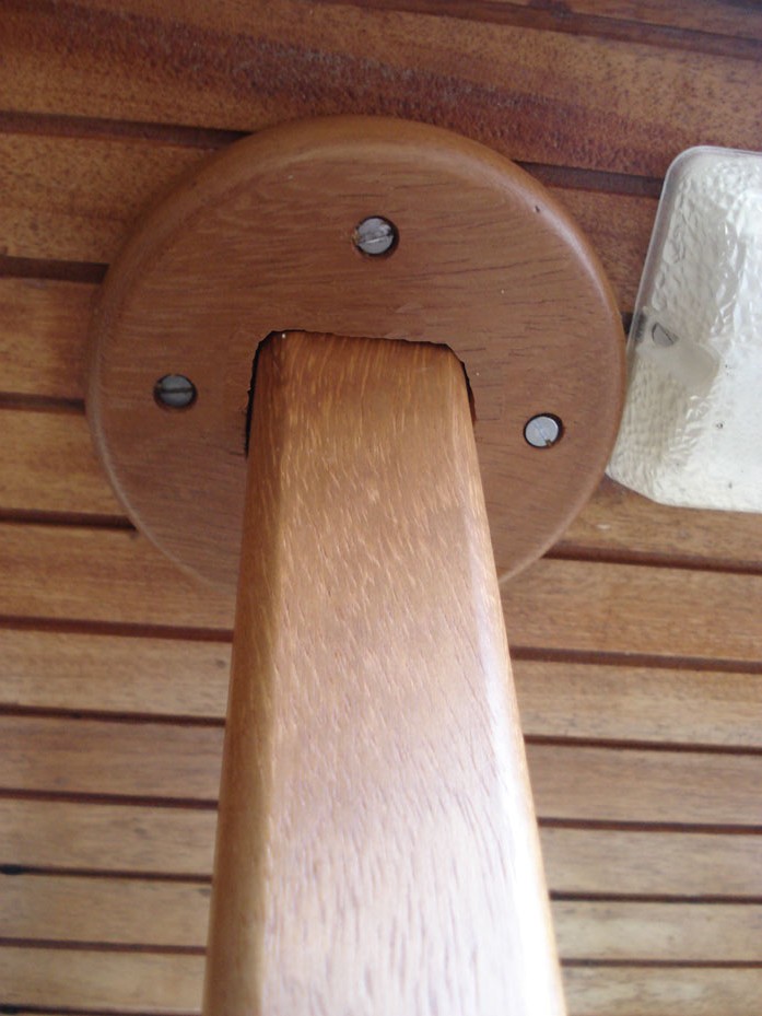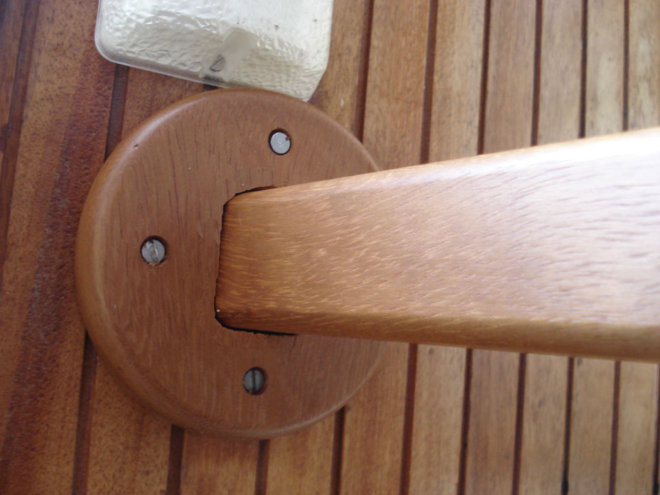 The main bulkhead was so damaged that it had to be covered up. I contemplated teak veneer or a sheet of thin teak-faced ply but opted in the end for cream coloured Vinyl which lightens the cabin considerably. The ceiling is still covered with the orginal teak slats so the interior does not feel too plasticky. The vinyl edge cut round the doorway in the main bulkhead was trimmed with a laminated wooden moulding and a cover board fitted where the vinyl meets the roof slats. These slats are problematic however as they have been fitted crookedly and do not allow ready access to the deckhead inside to get at the fixings of any deck gear mounted on the roof or to attend to leaks.
