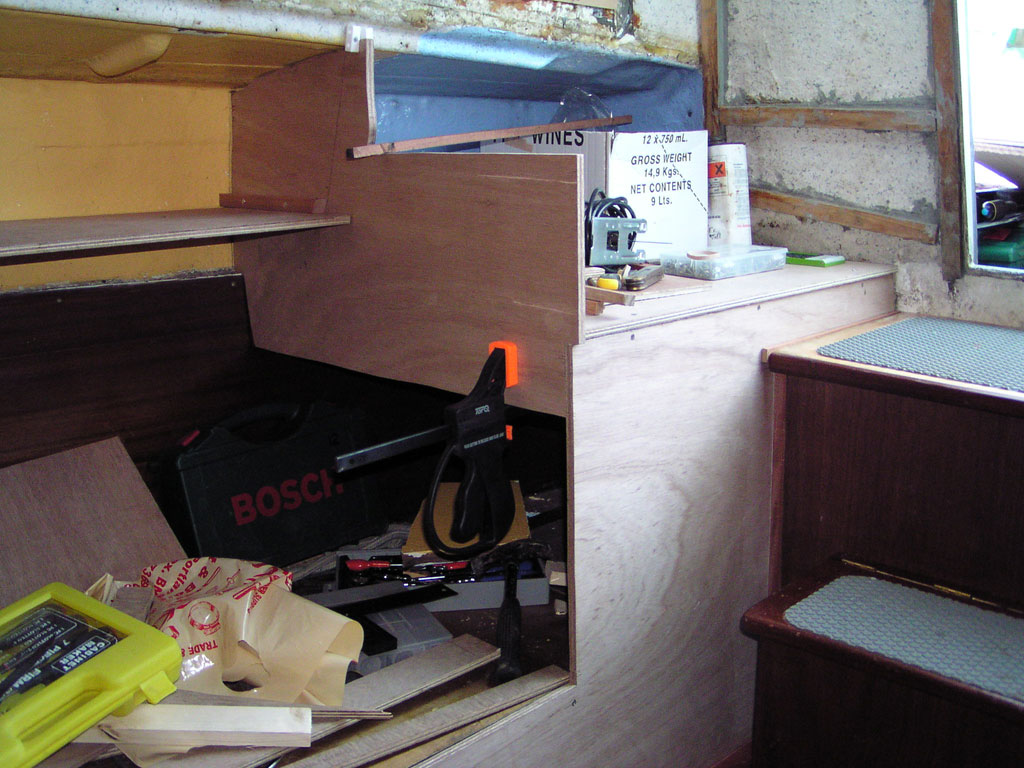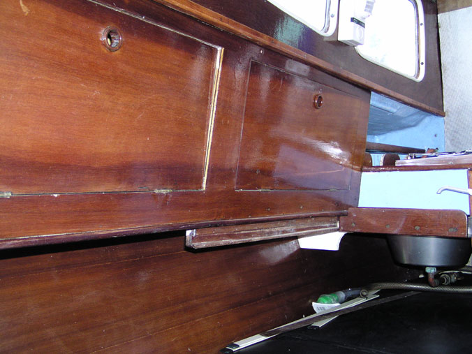 In 2003 when we purchased Lottie the layout of her main cabin was not quite the standard one. The underdeck lockers were neatly lidded which hid their contents nicely and stopped things falling out. But these lockers extended too far down for comfortable sleeping on the bunks below. The thin screws retaining the hinges were inserted edgewise into the 12mm plywood and this did not really work. The screws constantly worked loose. The hull under the mahogany lockers was lined with 4mm mahogany plywood which, with black vinyl upholstery, and wood-stripped ceiling all made for a rather dark saloon. [Click on small pictures to enlarge]