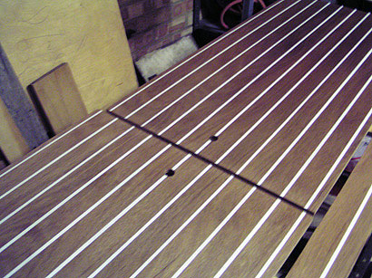 To buy the teak and holly inlaid marine ply for a Trident cabin sole would cost over £300 as it requires more than one 8’x4′ sheet. This is my cheat – costing 50p in masking tape plus a small amount of white emulsion paint to create the stripes. Once covered with tough floor varnish the white paint turns beige but shows the grain through and if you don’t look too closely it does the job. The finished floor pictured has put up with 5 year’s wear.