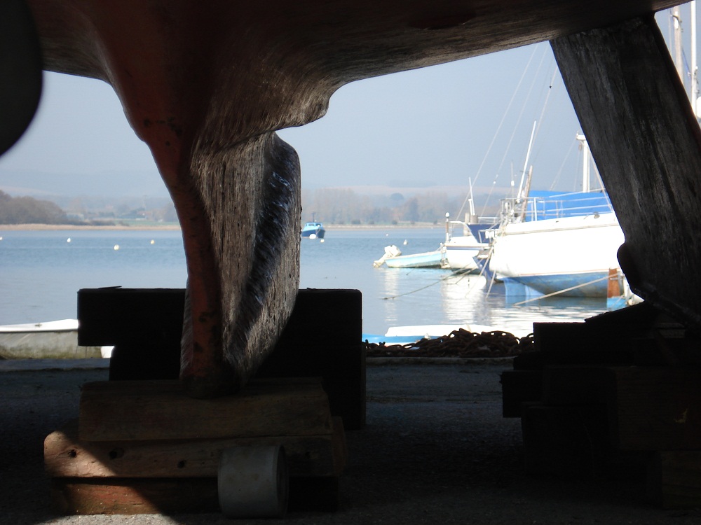The bilge keels are about one inch shorter than the central ballast keel so on hard surfaces Lottie rocks slightly and requires a wedge under one side if you need to keep her steady.