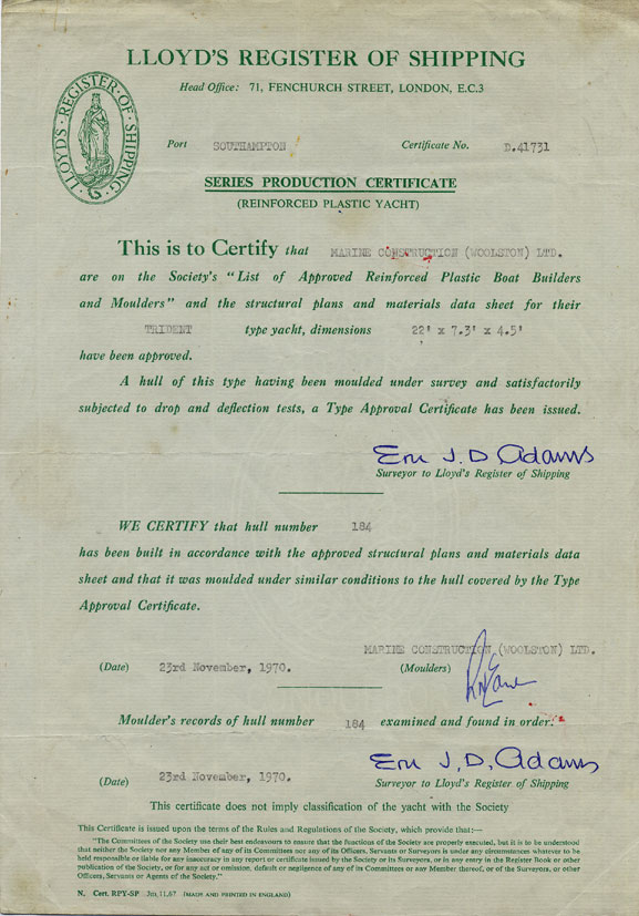 1970: 23 November 1970: Lloyds Hull Moulding Certificate for Trident No 184 issued. The hull was fitted out by Ben Benstead who kept her mostly at Hillhead Haven in Southampton Water. Ben sailed her to the West Country and across the Channel and recalls with fondness visiting the Thorney Channel in Chichester Harbour. She was fitted with a Vire 6 engine and a heavier mast than normal.
