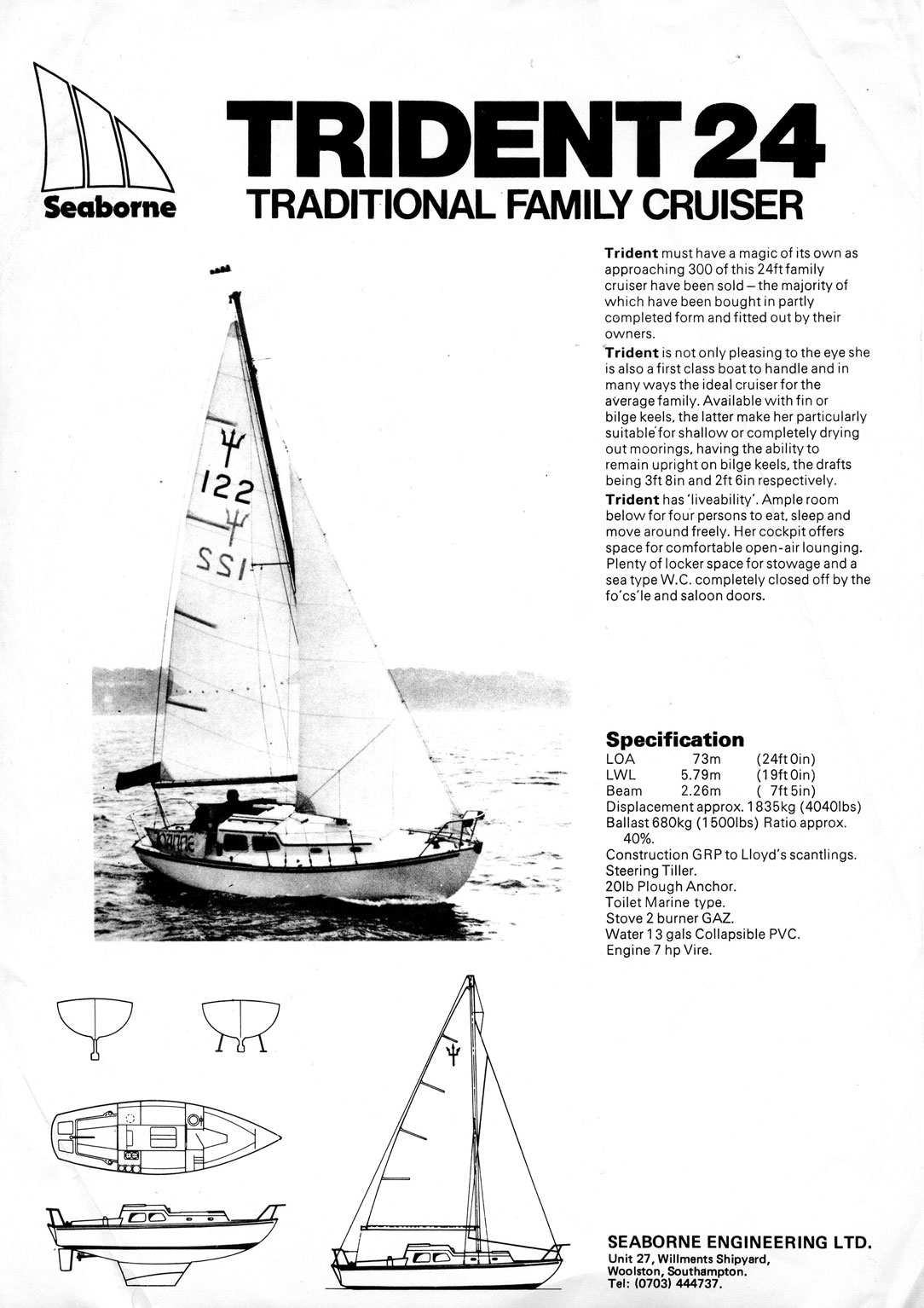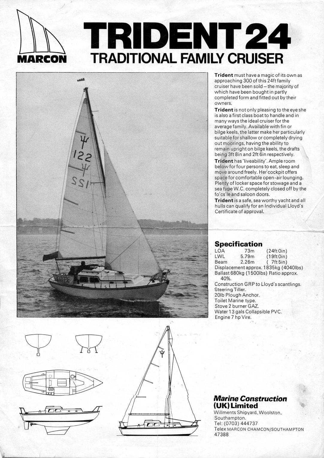 After Marcon went bust, Eric White bought most of the moulds, including those of the Trident 24 “Traditional family cruiser”. Mouldings for DIY completion were then offered by Eric’s new company, Seaborne Engineering. Eric seems to have adapted Marcon’s flyer by simply tweaking the Marcon logo in the top left corner and modifying the address.
