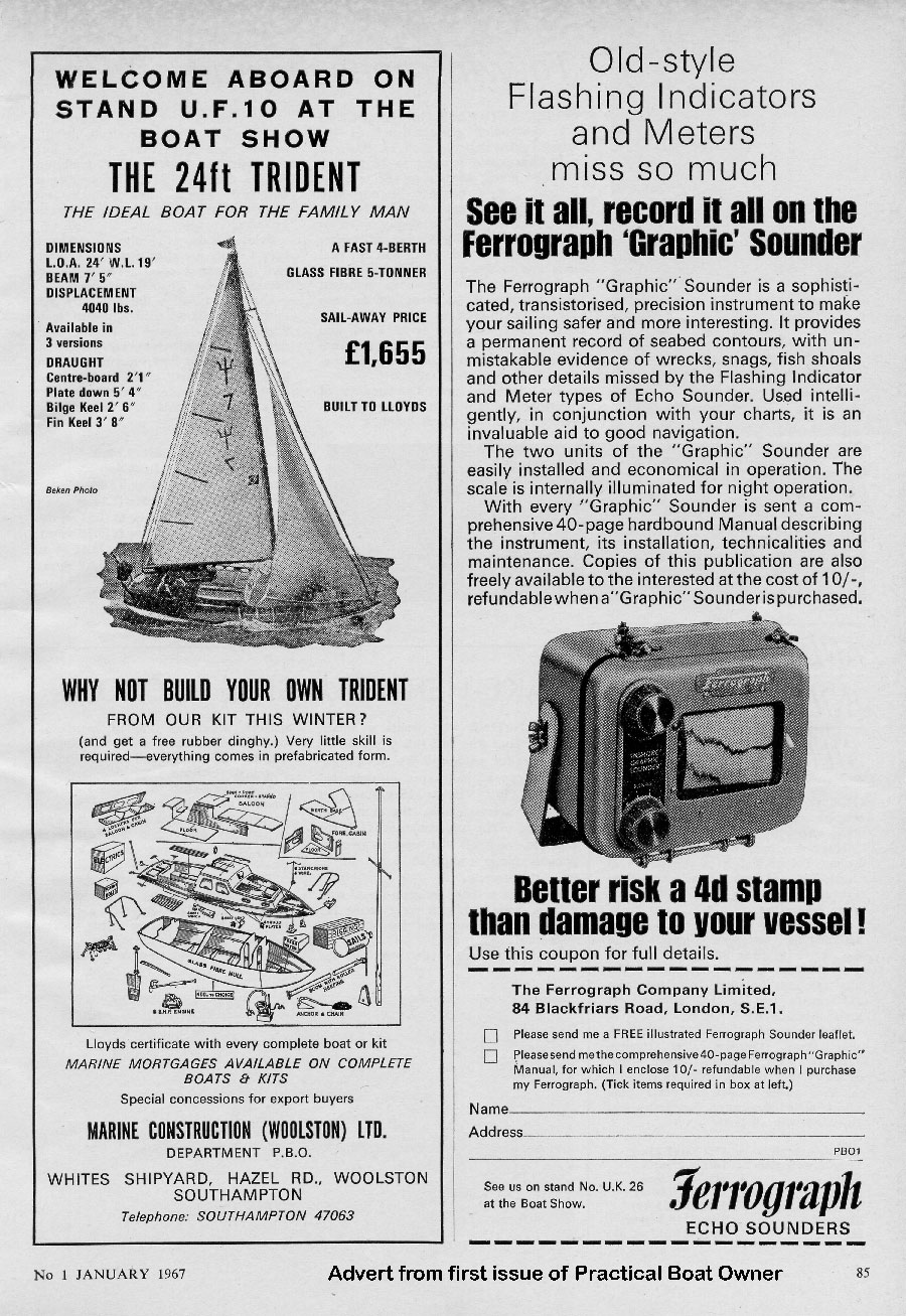 The first issue of Practical Boat Owner appeared in January 1967. Marcon were one of the first to advertise in it – and PBO’s advertising manager, Bob Tyler, bought Trident number 71 as a kit. This was to become the fin-keeler Chamois of Wight. Bob Tyler went on to play a key role in the establishment of the Trident Owners Association. It was Bob who wrote to all known Trident owners (presumably using contacts supplied by Marcon who were very supportive towards the owners association) inviting them to an inaugural meeting in January 1968. The founding editor of PBO Denny Desoutter often expressed his admiration of the Trident.